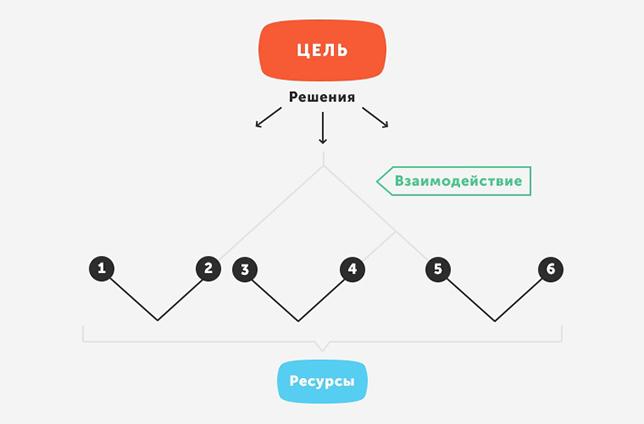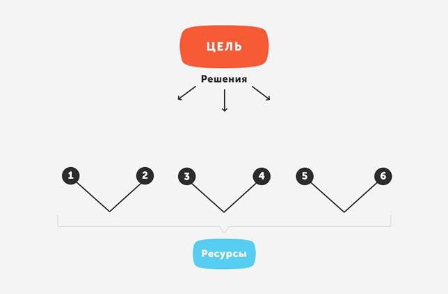 Вверху отмечается цель — это задача, решение которой вы пытаетесь найти. Затем пространство делится на две части. Сверху располагаются варианты действий, снизу— ресурсы, которыми вы обладаете. Генерируя идеи, все участники молча записывают их на стикеры и приклеивают к одному из двух блоков (сверху или снизу). Доска размещается в таком месте, где к ней есть свободный доступ в любое время.